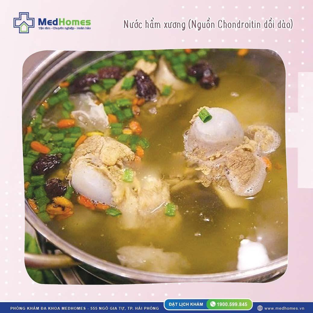 Nước hầm từ xương ống, sụn heo hoặc bò chứa hàm lượng Chondroitin tự nhiên rất cao. Đây là thành phần giúp sụn có độ đàn hồi và giữ nước, ngăn ngừa tình trạng khô khớp.