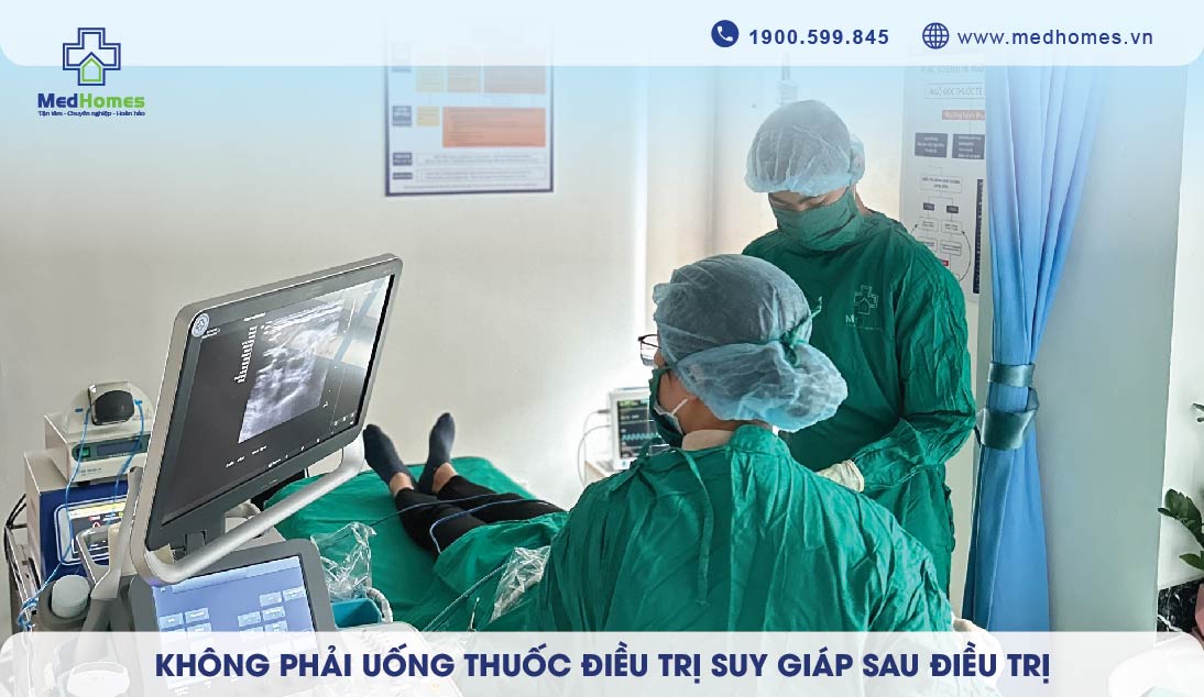 ????Sau khi đánh giá kết quả siêu âm và các xét nghiệm máu, chị được tư vấn điều trị hủy u giáp bằng phương pháp đốt sóng cao tần (RFA). Đây là phương pháp điều trị u giáp ít xâm lấn, không nằm viện- người bệnh ra về sau 30ph theo dõi tại phòng khám, bảo tồn tối đa nhu mô giáp lành và người bệnh không phải uống thuốc điều trị suy giáp sau điều trị, đặc biệt với người trẻ như chị H thì phương pháp này không để lại sẹo.