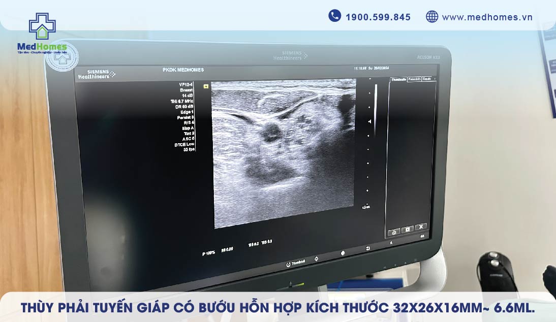 ????Chị N.T.H 45 tuổi ở Hải Phòng đi khám sức khỏe định kì tại phòng khám đa khoa MedHomes, chị không có tiền sử bệnh lý tuyến giáp cũng như chưa siêu âm kiểm tra tuyến giáp lần nào. Trong lần khám này, Bác sĩ khám quan sát thấy cổ bên phải to hơn bình thường, nghi ngờ có u giáp và chỉ định siêu âm tuyến giáp. Kết quả là thùy phải tuyến giáp của chị có bướu hỗn hợp kích thước 32x26x16mm~ 6.6ml.